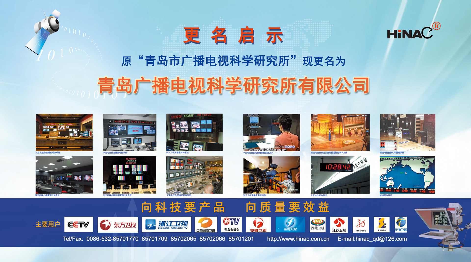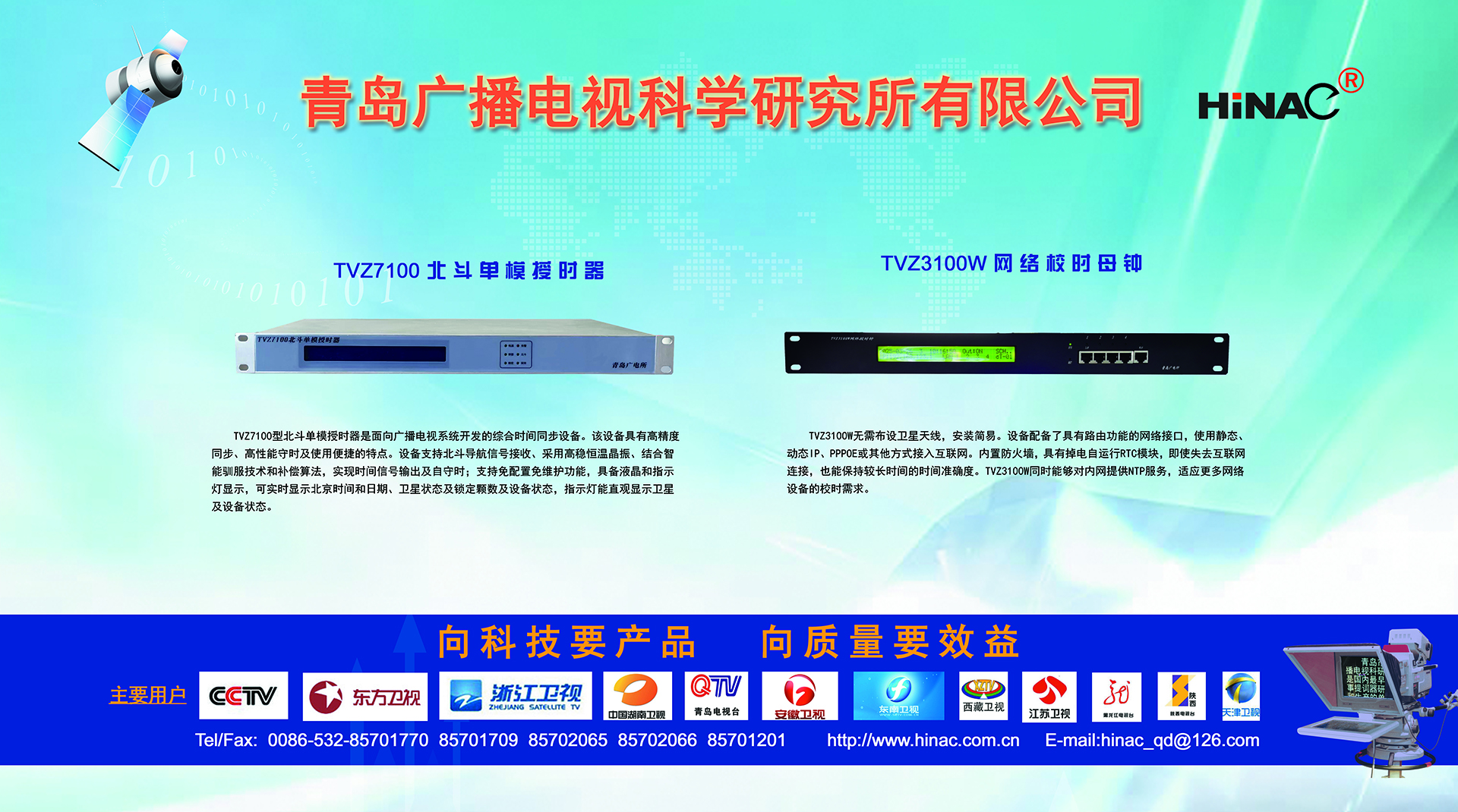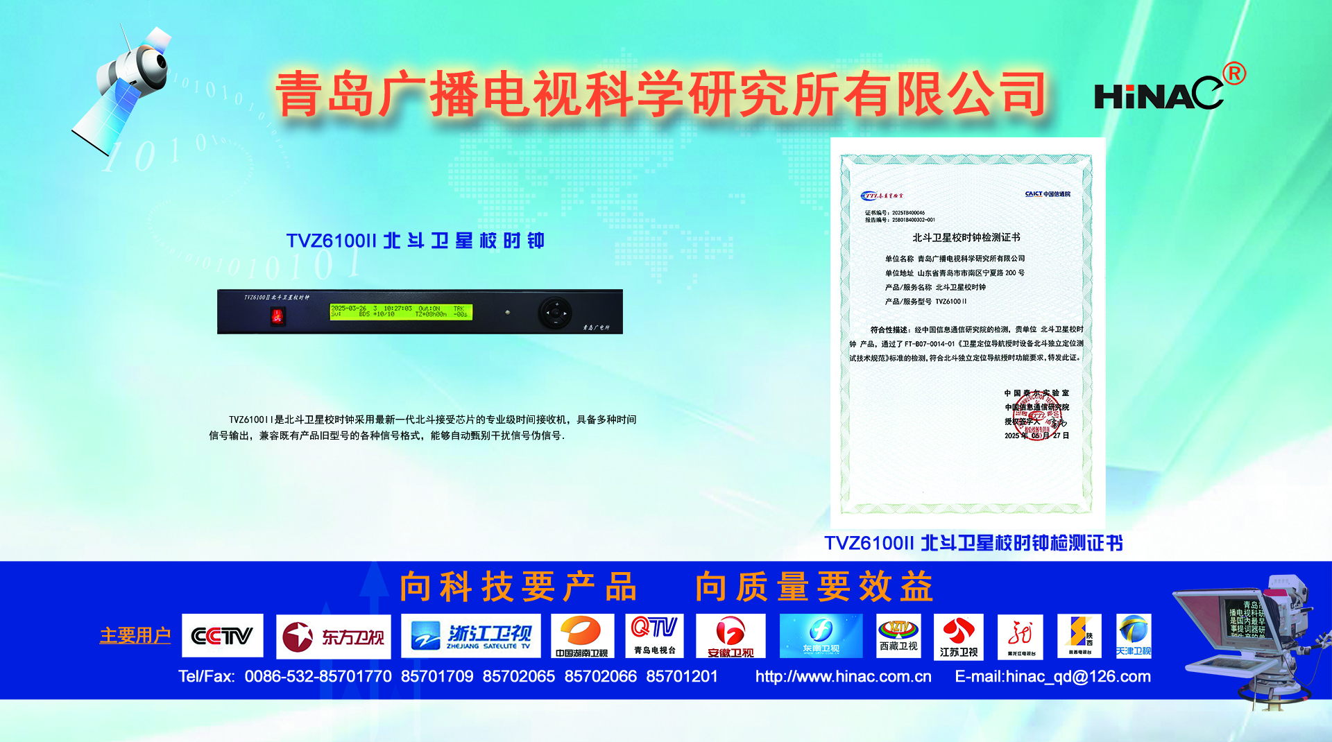 25年不悔的執(zhí)著追求! 25年不懈的專業(yè)堅(jiān)持! 青島廣播電視科學(xué)研究所有限公司(簡稱青島廣電所)以其對(duì)廣電科技事業(yè)無限的熱愛,以及為爭(zhēng)做中國最優(yōu)秀廣電產(chǎn)品供應(yīng)商的美好理想,25年如一日,深耕廣電設(shè)備這塊沃土,已經(jīng)形成且被市場(chǎng)高度認(rèn)可的成果有: TVZ系列GPS/北斗自動(dòng)校時(shí)鐘系統(tǒng) TC系列電視播音提詞器及電視直播系統(tǒng)整體解決方案 TL系列泰麗訊源指示系統(tǒng) QD系列搶答表決評(píng)分系統(tǒng) IC系列廣電一卡通管理系統(tǒng) 同時(shí)向:廣電設(shè)備集成商、地鐵輕軌信號(hào)系統(tǒng)設(shè)備供應(yīng)商及其它業(yè)務(wù)方向創(chuàng)新、拓展、前行! 青島廣電所在國家廣電傳媒事業(yè)不斷發(fā)展的今天,愿意和您攜手并進(jìn),為我們共同的事業(yè)發(fā)展添磚加瓦開拓創(chuàng)新。愿意和您一道,把工作中的一個(gè)奇思妙想轉(zhuǎn)變?yōu)橐豁?xiàng)偉...